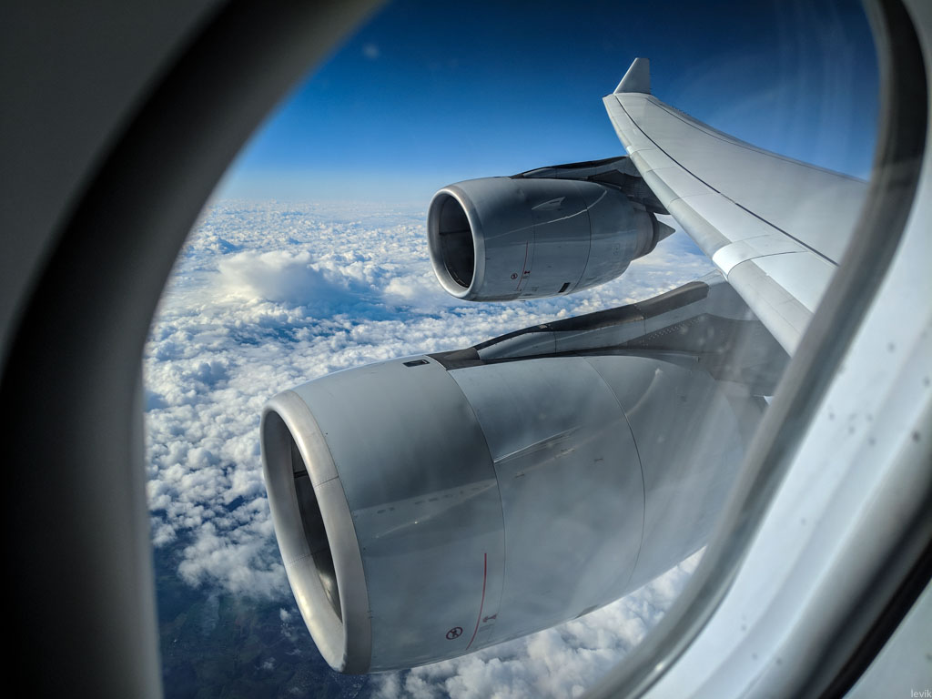 1. Первая удача: мой рейс обслуживает A340-600 Аэробуса. Эти самолёты были созданы для свехрдальних маршрутов, но, как и с другими 4-моторными моделями, их двигатели жрали слишком много топлива. В итоге спрос был низким, и Аэробус перестал их делать в 2011. Сегодня на коммерческих рейсах можно встретить всего три главных типа самолёта с четырьмя моторами, и A340 - самый редкий из них. (Другие - оба двухпалубные, A380 и Боинг 747.) Последний раз мне доводилось летать на таком в 2013 году, когда он обслуживал самый длинный в мире рейс.