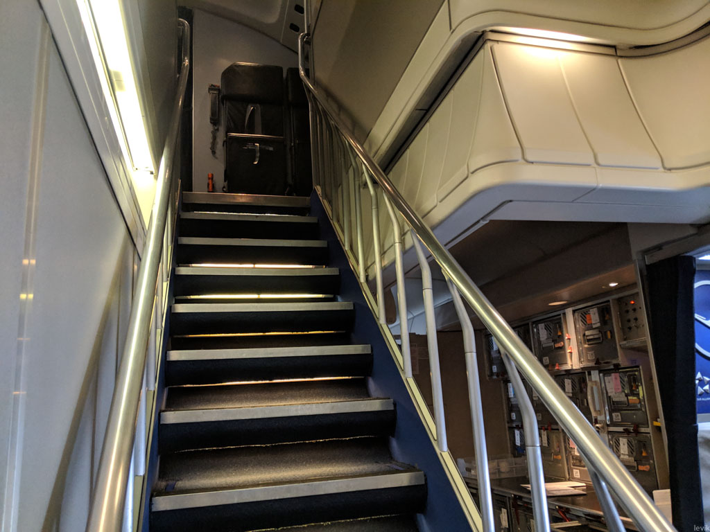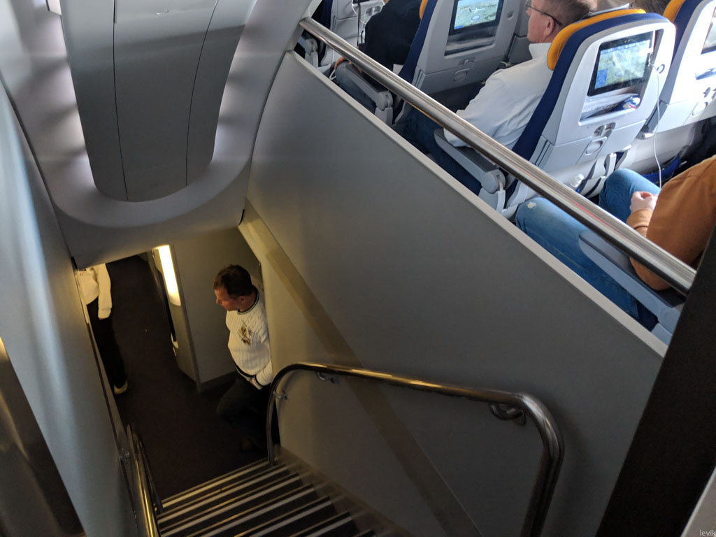 30. Во время посадки прохожу мимо лестницы на второй этаж. Сегодня я лечу снизу, но есть на то хорошая причина. Во первых, на втором этаже нет ничего особенного - у Люфтганзы там такой-же бизнес класс (на этом рейсе вообще нет первого). А во вторых, я выбрал довольно необычное сидение.