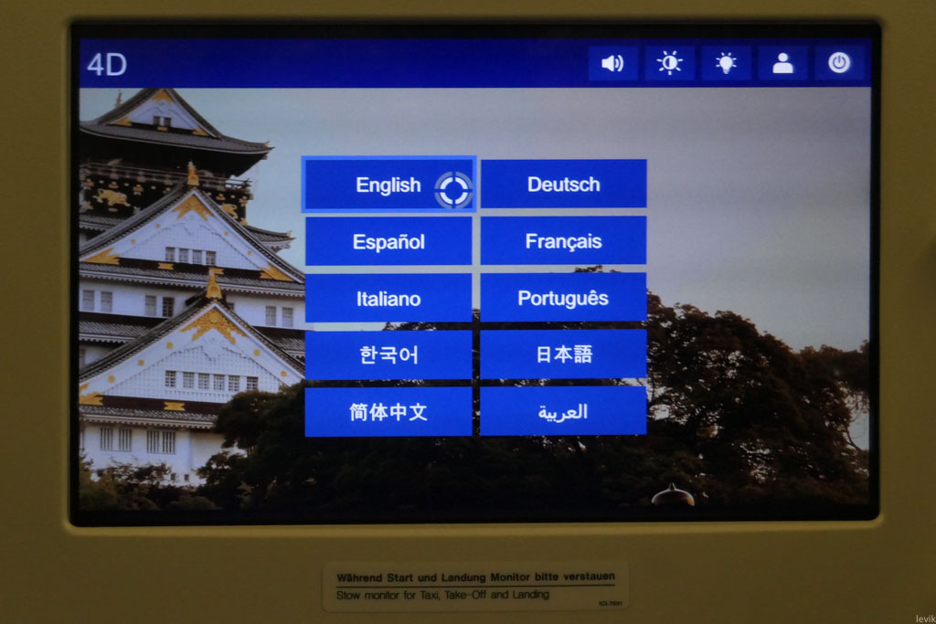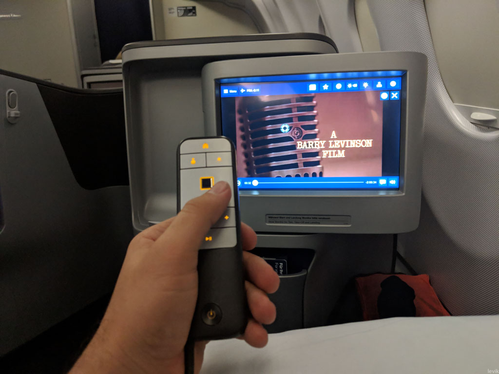 10. Контролируется он специальным пультом. Не очень удобная вещь. Экран на спинке сидения спереди почему-то не по центру, и чтобы его нормально смотреть, надо сдвинуть вбок. Разумеется во время взлёта и посадки, стюардессы заставляют его задвинуть обратно.