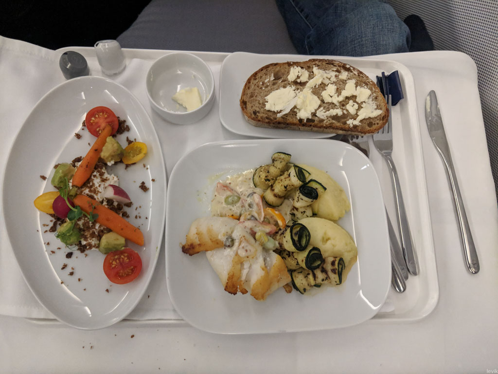 16. Кстати, насчёт ужина! Вот он. Я выбрал запечёную рыбу. В меру вкусно для авиа еды.