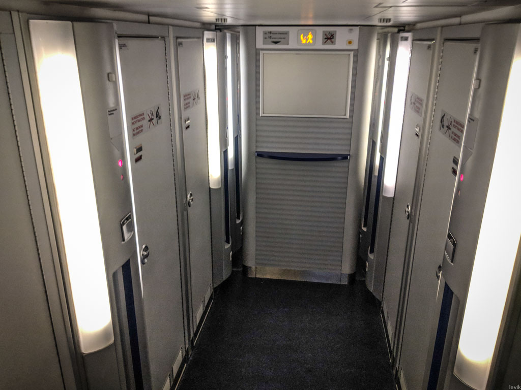 20. Внизу небольшой пятачок, и пять туалетов. Так как предусмотрена возможность, что пассажиры тут будут ждать своей очереди, потолок этой комнатки тоже оборудован кислородными масками.