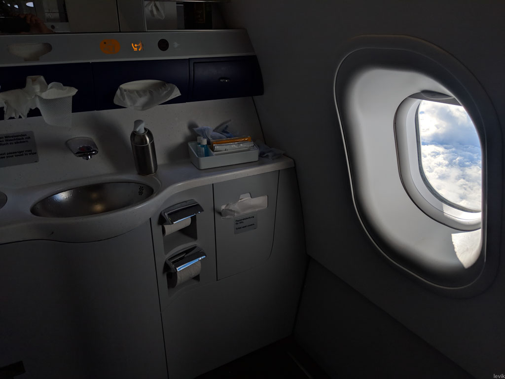 21. У бизнес-класса свой туалет, даже два, на главном этаже. Он просторнее, и в нём есть очень козырная фишка - окно! Не часто встретишь окно в туалете самолёта!