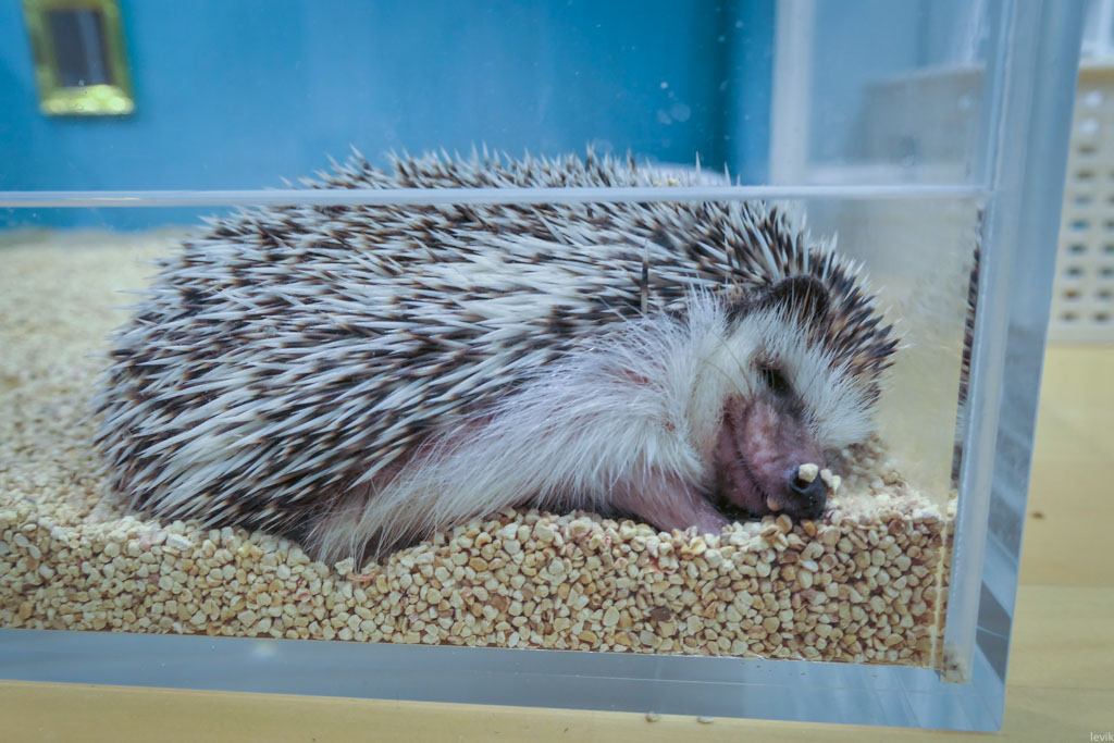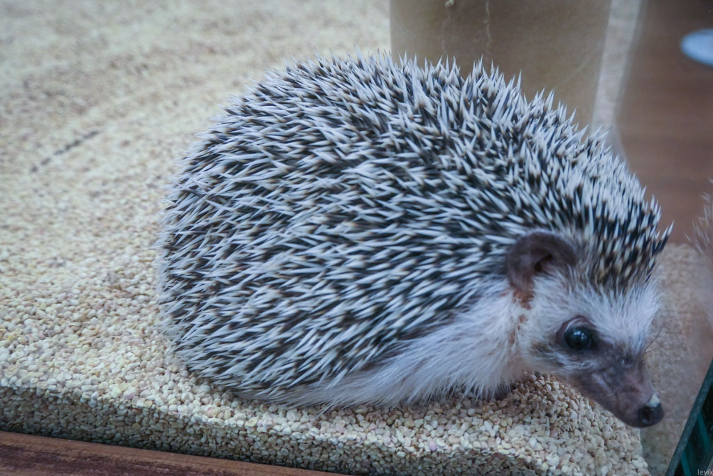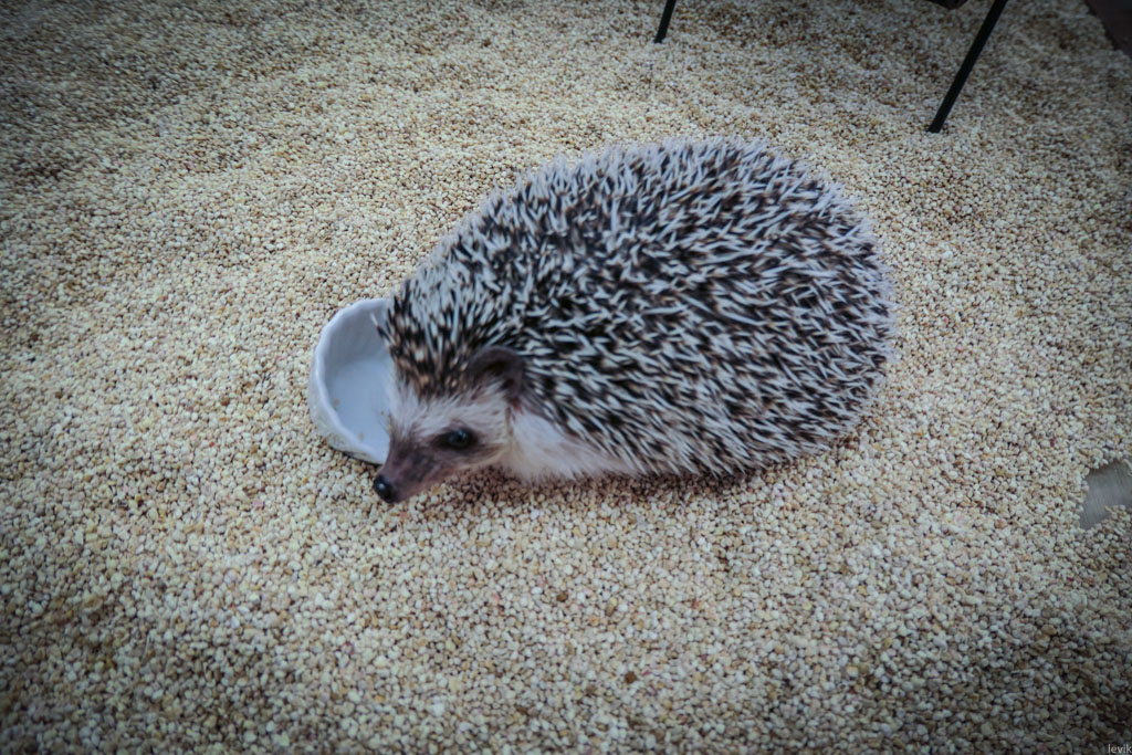 4. Оплатив четверть часа пребывания, я оказался в помещении кафе. Здесь по периметру стоят аквариумы в которых живут ёжики.