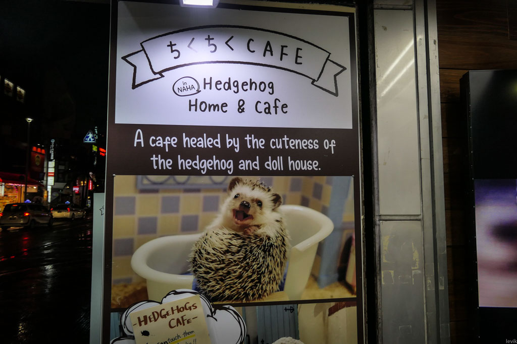 1. Впервые, заметив ежиное кафе на близлежащей коммерческой улице города Наха (остро Окинава), я прошёл мимо. Я конечно очень хотел увидеть живых ёжиков, но всё же мне помешала совесть. Я до сих пор неоднозначно отношусь к таким заведениям, и сперва не хотел его посещать.