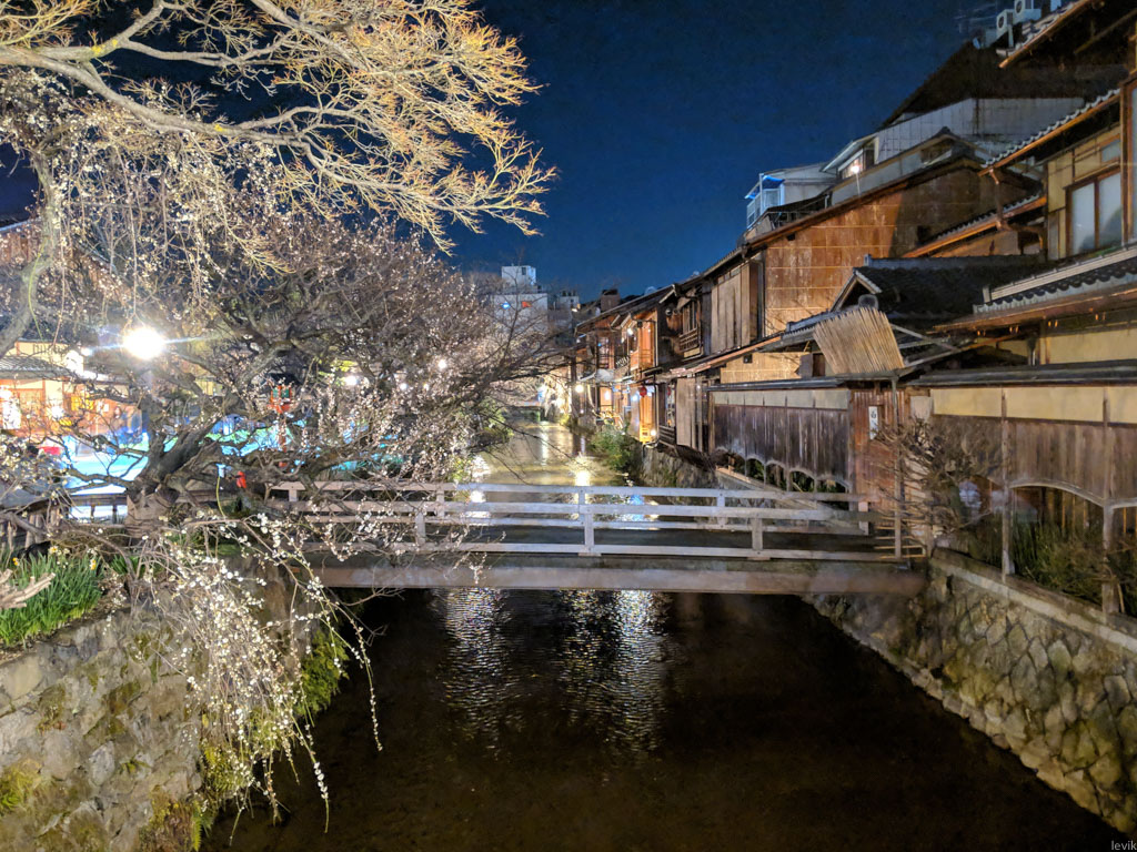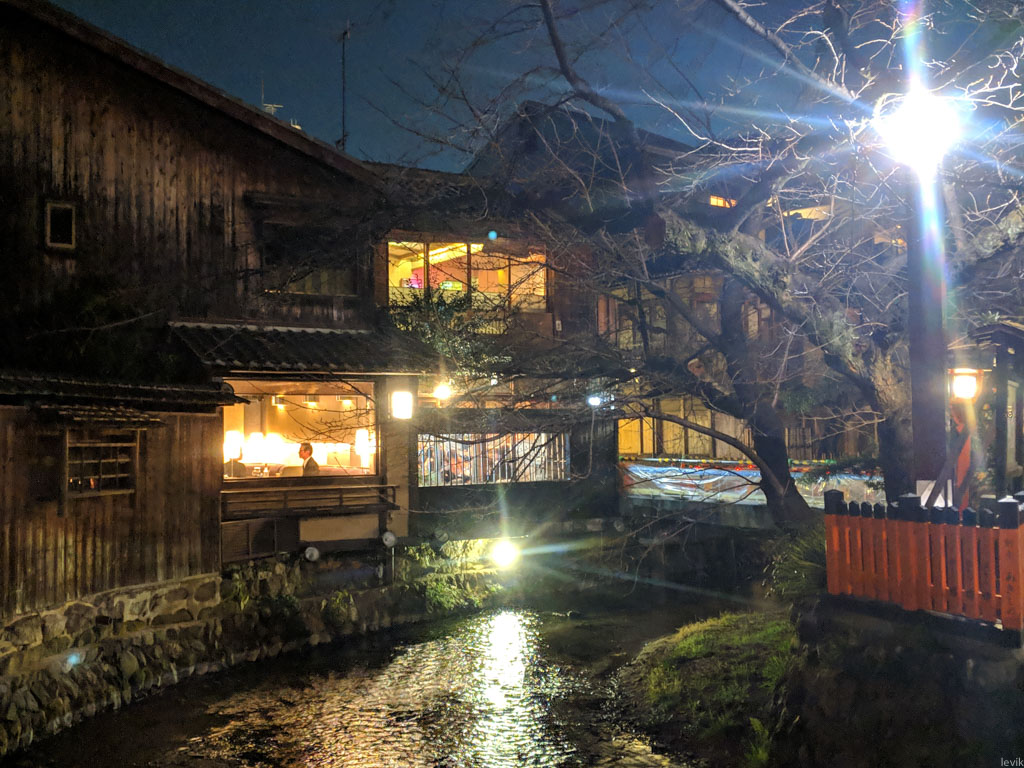 3. Сворачиваю в Гион. Тут последние клиенты ужинают в престижных ресторанах, а под их окнами протекает канал. Главная беда с этими фотографиями в том, как сильно слепят камеру телефона любые яркие фонари.