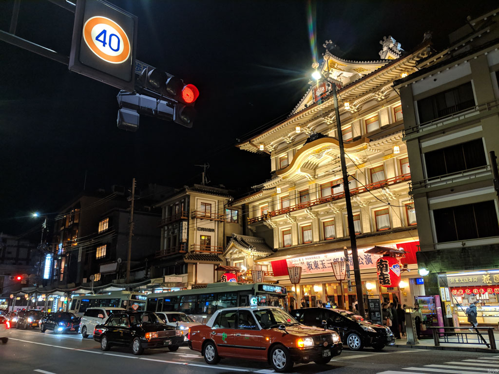 2. На другой стороне недавно отреставрированный театр кабуки, весь его фасад подсвечен.