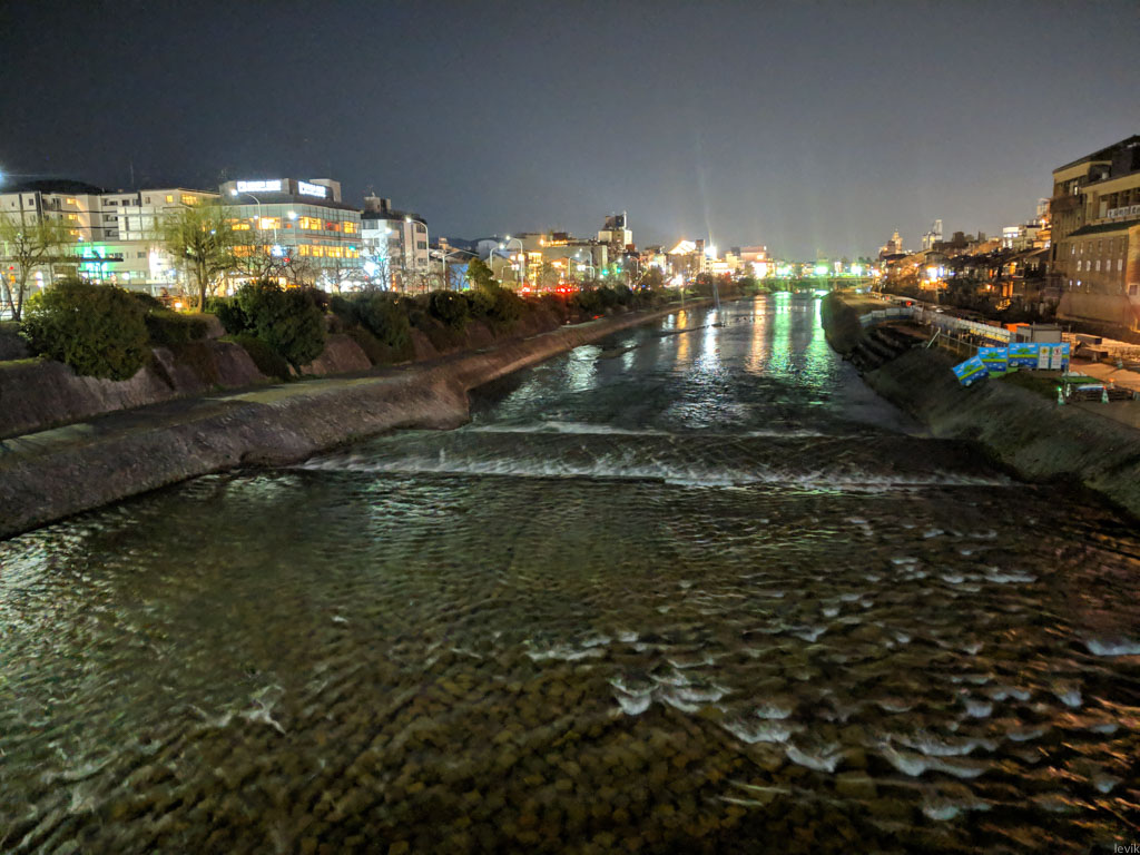 1. Перехожу один из многочисленных киотских мостов. Под ним весело журчит в темноте река Камо. Тут слева неплохо видна её прекрасная набережная, хоть её и не подсвечивают.