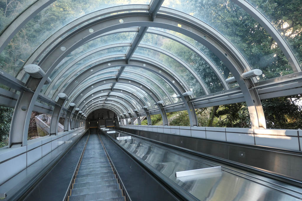 Люблю "уличные" эскалаторы. Этот сделан внутри стеклянной трубки, потому что в Японии часто идут дожди.