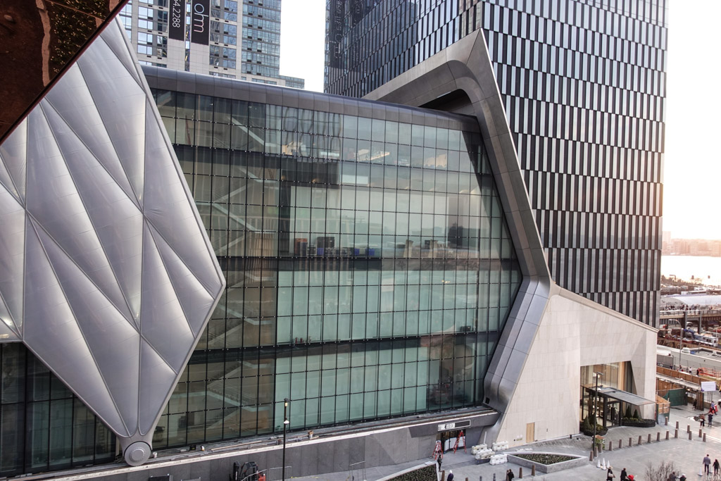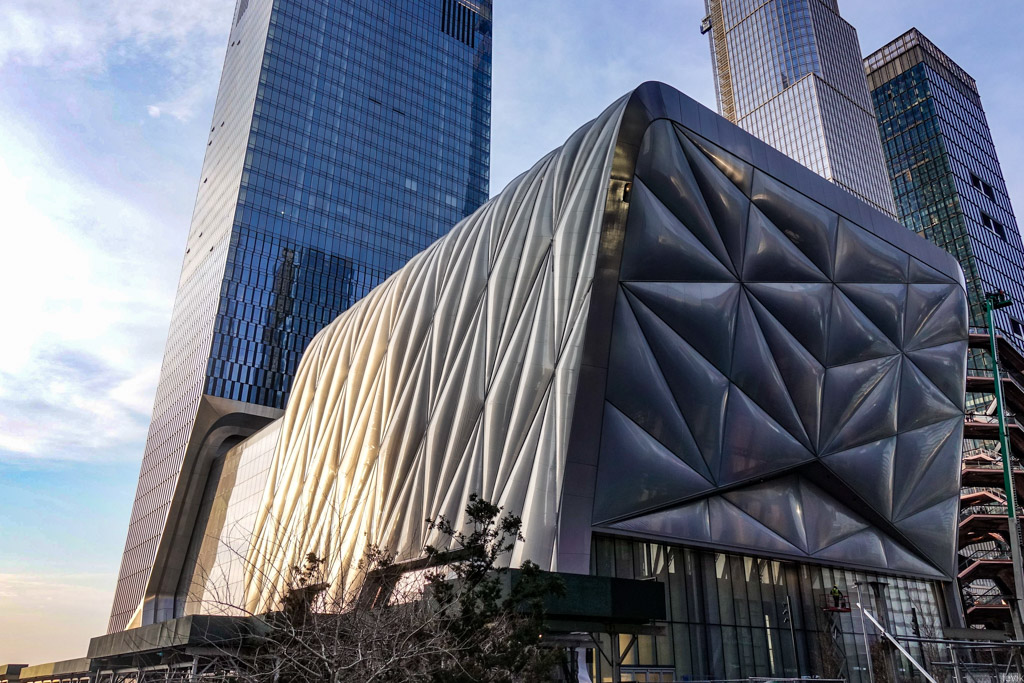 4. Подходим к Hudson Yards по Хайлайну, и что мы видим в первую очередь? У подножья одной из высоток примостилось одно из самых интересных зданий комплекса, концертный зал под названием The Shed ("Сарай").