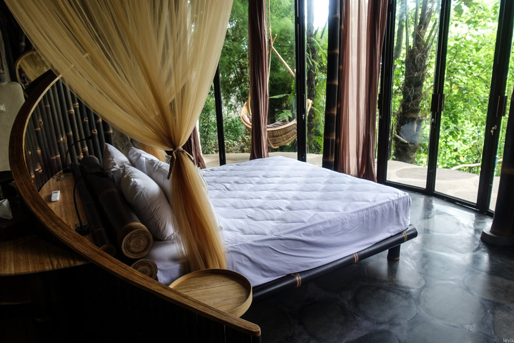 39. А вот спальня, с выходом на веранду, и видом на зелёные заросли бамбука. Наверное очень приятно тут просыпаться с утра! Двери на веранду застеклены, и в помещении есть кондиционер, так что здесь можно укрыться от тропической жары.