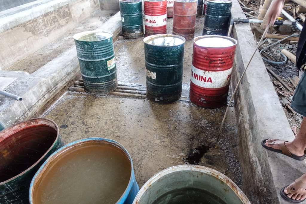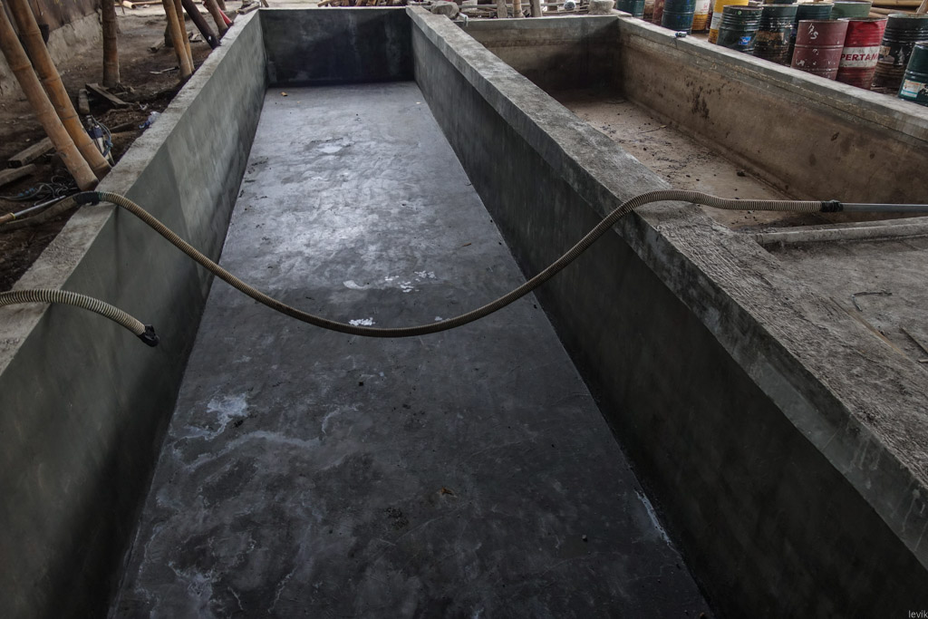 14. Вот наполненная ванна. Сверху отмокающих стволов ставят бочки, чтобы они не всплывали. Процесс пропитывания бамбукового дерева длится около недели.