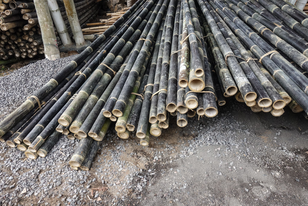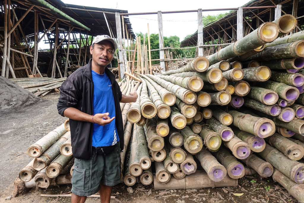 9. Я думал, что с бамбуком просто: срезал огромный росток, и вот тебе бревно. Можно из него тут же что-то строить. Теперь мне немного стыдно, что я был столь наивен. Во первых, надо знать, когда можно срезать бамбук. Нам объяснили, что растение достигает своей максимальной высоты только на второй год. Но надо потом подождать ещё годик, чтобы ствол укрепился. При этом, подходят лишь те ростки, которые стоят прямо. Если бамбук растёт под углом, то его стенки будут неравномерными, и он будет непригоден для строительства. Green Village работает с несколькими фермерами бамбука, и закупая у них стволы, их торцы красят в разные света. Если потом обнаружится брак, то можно вычислить, кому недоплачивать.