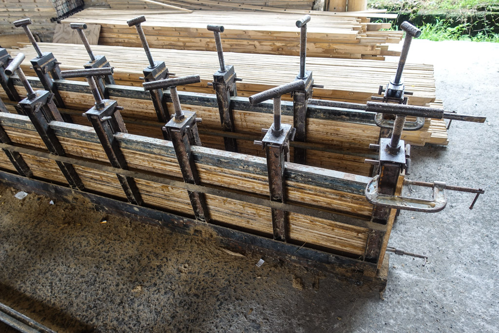 20. А в этих тисках планки прессуются в доски. Их смазывают специальным клеем и лаком, чтобы получалось крепко.