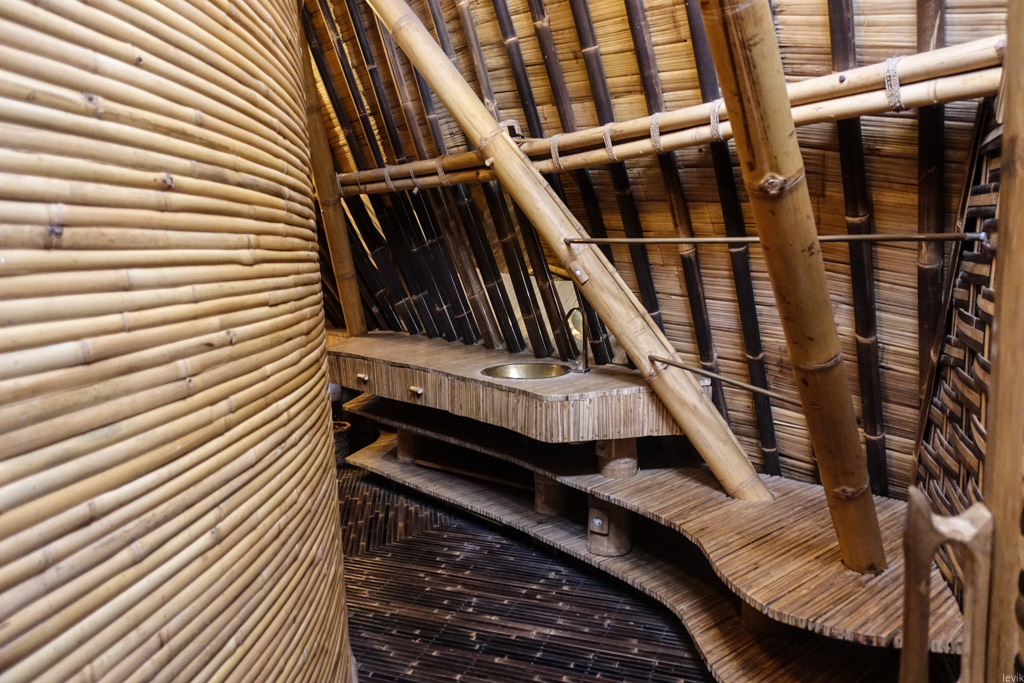 41. Ну и наконец, ванная. Раковина и душевая (за поворотом) тут сделаны из металла, а в остальном всё бамбуковое.