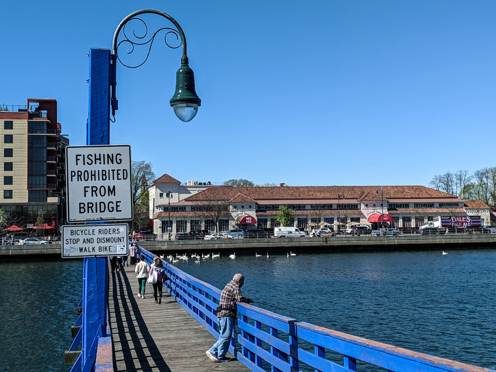 В трёх минутах ходьбы от моего дома расположен длинный залив, а через него перекинут маленький деревянный мостик для пешеходов. Так как он для пешеходов, с него запрещается рыбачить, а велосипедистам положено спешиться, и толкать велосипеды рядом. На мосту специальные знаки висят с этими правилами, но их никто не слушается.