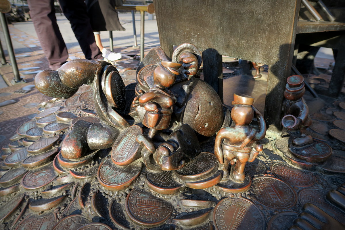 1. Создатель этих милых фигурок - Американский художник-скульптор, его зовут Том Оттернес. В его бронзовых работах часто освещаются темы связи власти и денег. Он любит играть с различными масштабами (вы заметили крохотных человечков на фотографии выше?), в его работах деньги часто символизируются американскими одноцентовыми монетами.
