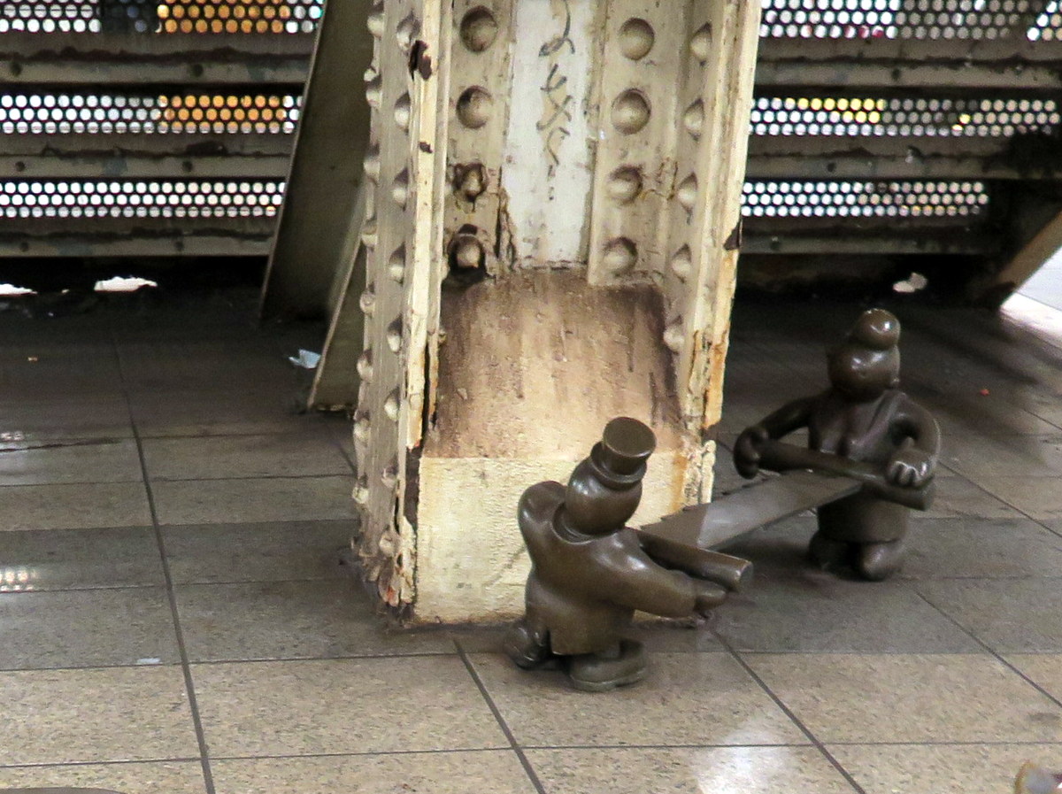 11. Группа фигурок дублируется на обеих платформах станции, так что люди, едущие в обе стороны могут наслаждаться одинаковыми человечками. Вся работа называется "Подземная жизнь", Оттернесс выполнил её в 2001 году. Здесь чётко прослеживаются элементы классовой борьбы - между богачами и рабочим классом. На фотографии выше богач собирается куда-то уезжать, прихватив с собой мешок денег. А в центре фото ниже, видно что именно охраняют полицейские.