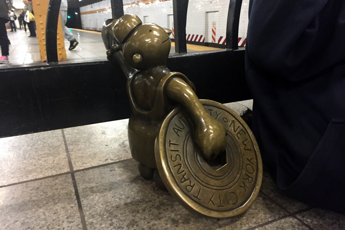 15. Ради метро, Том Оттернесс отступился от своей любимой одноцентовой монеты, и изобразил в руке этой девушки жетон метро. Такие уже давно не используют, но раньше, много лет назад, вход в метро Нью Йорка был по жетонам, которые продавались на станциях. Конкретно такие жетоны появились в 1995, когда цена на проезд поднялась до $1.50, и были отменены в 2003. После них, система оплаты полностью перешла на магнитные карты.