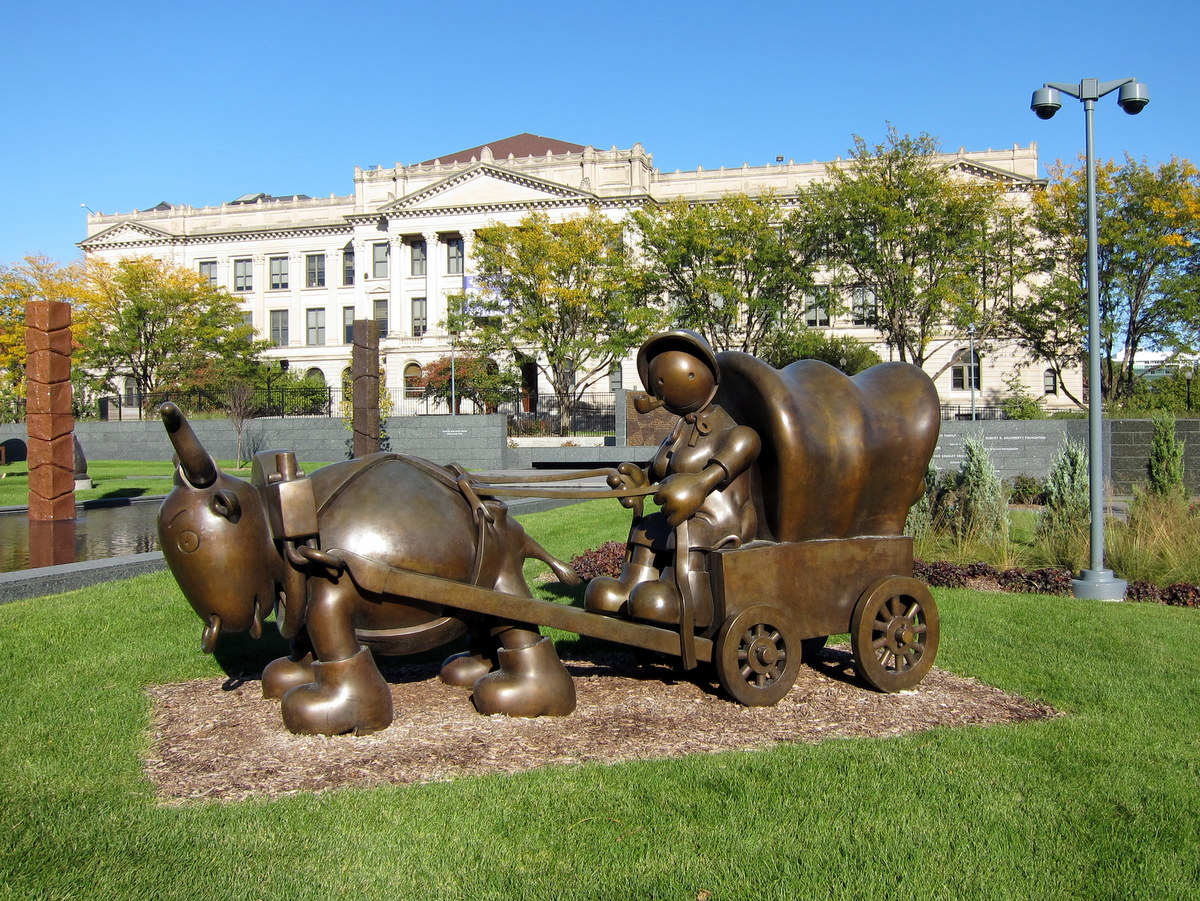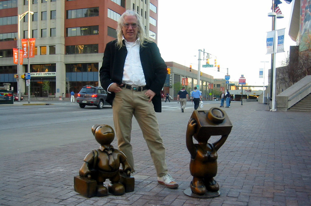 2. Вот Том в Индианаполисе, рядом с двумя своими детищами. Эти фигурки называются "Туристы" - муж несёт чемоданы, а жена фотографирует. Оба смотрят вверх на какое-то большое здание. Оттернесс часто повторяет элементы своих работ, например мужчина с чемоданами может появиться где-нибудь на другом конце света, как часть совсем иной композиции.