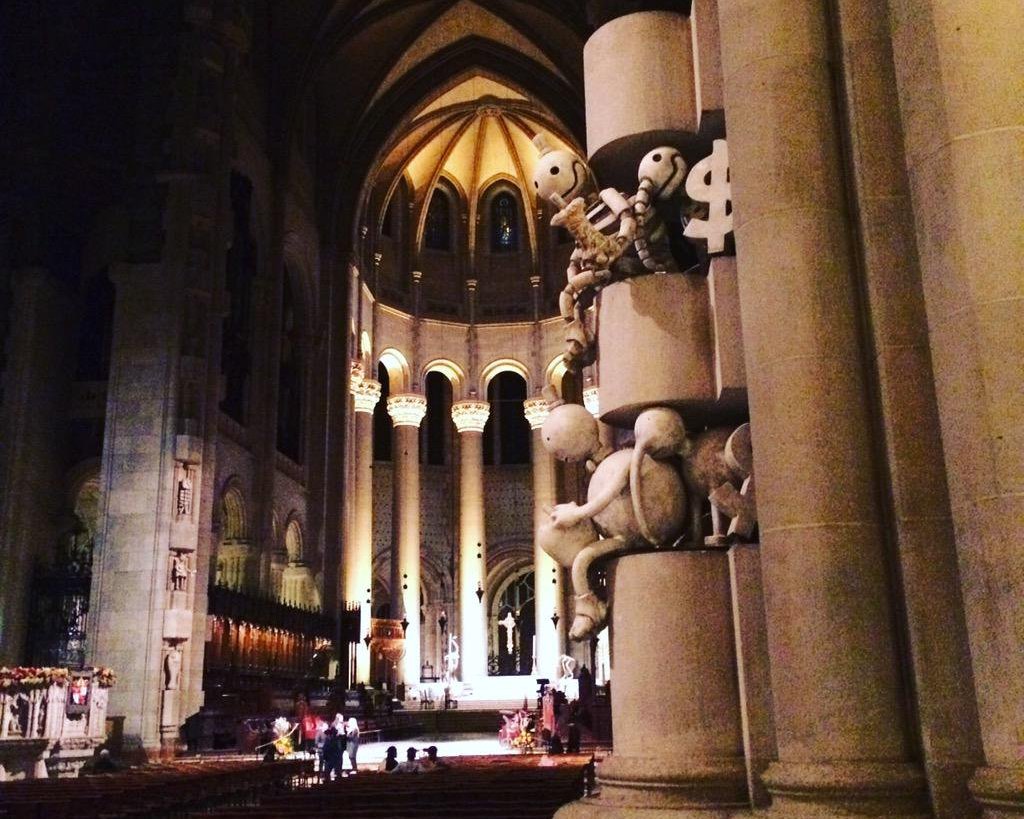34. Пока готовил этот пост, узнал, что в соборе St John the Divine в северном Манхэттене прошла грандиозная выставка с участием Тома Оттернесса. Внутренности собора временно нарядили несколько художников, и Том поработал над не-бронзовыми фигурами, которые сливались с каменными стенами. (Бронзовые элементы тоже были, конечно.)