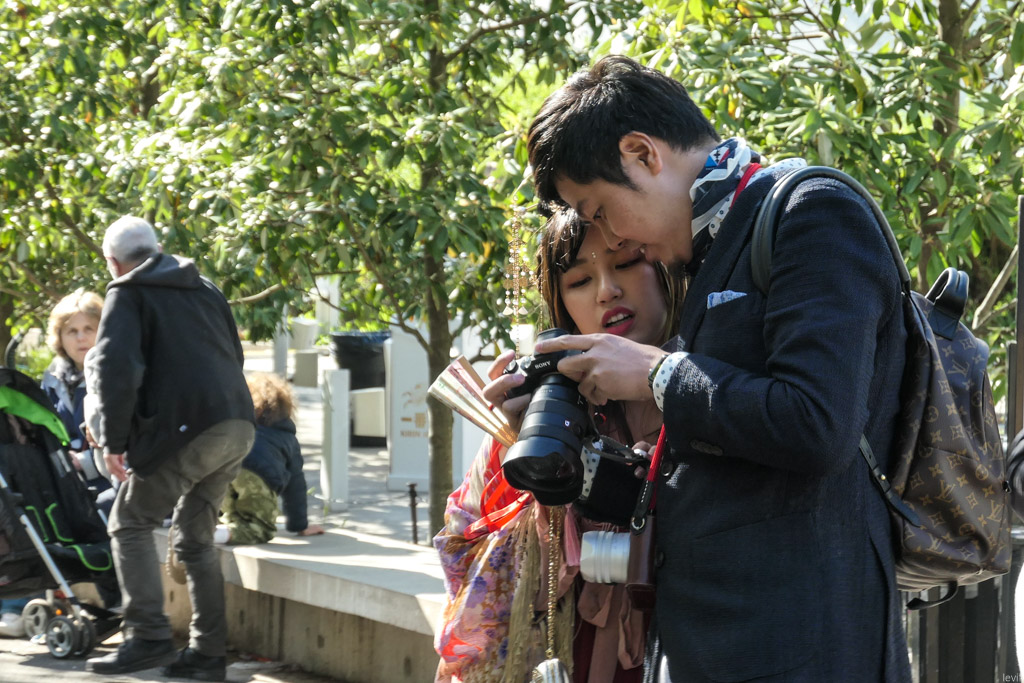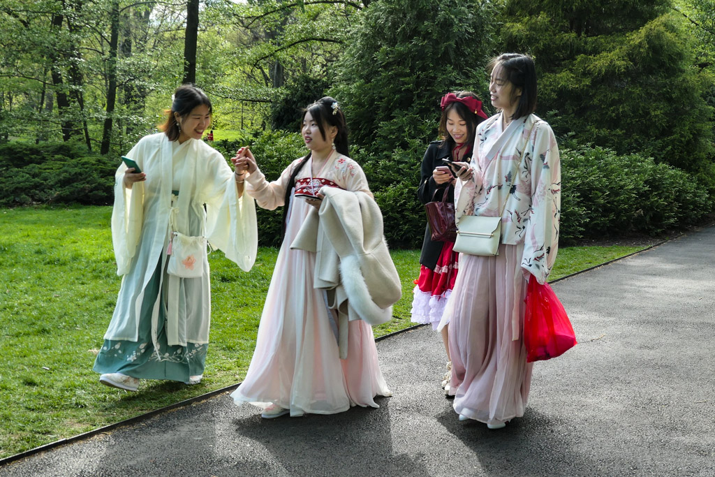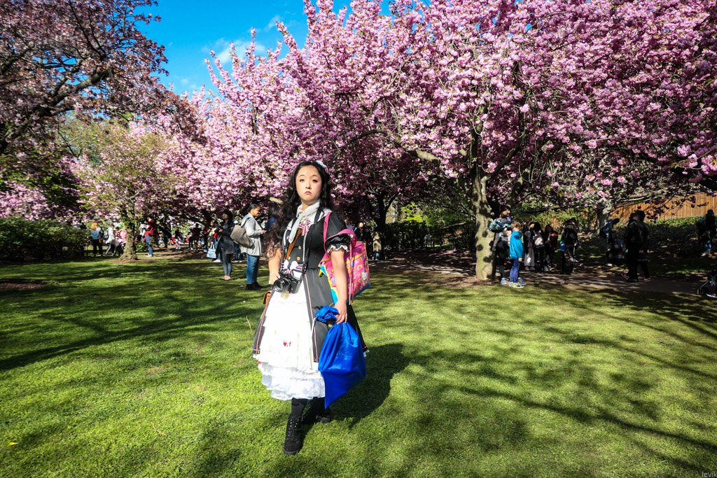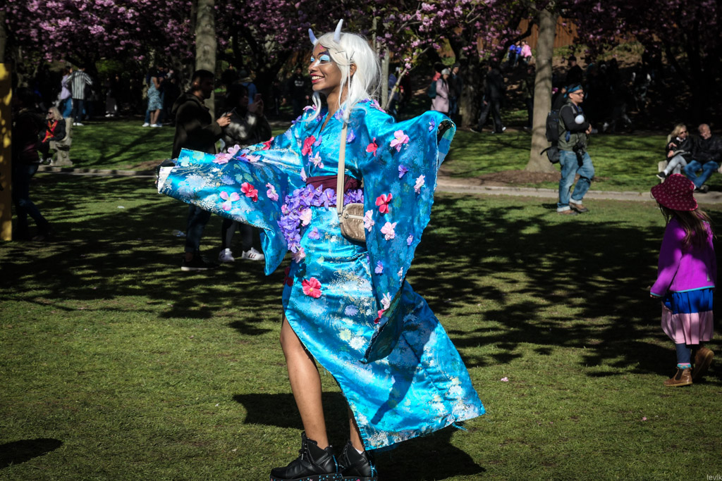 21. Как я уже сказал, посетители фестиваля (особенно девушки) одеваются в яркие праздничные наряды с азиатской тематикой, чтобы фотографироваться на фоне цветения.