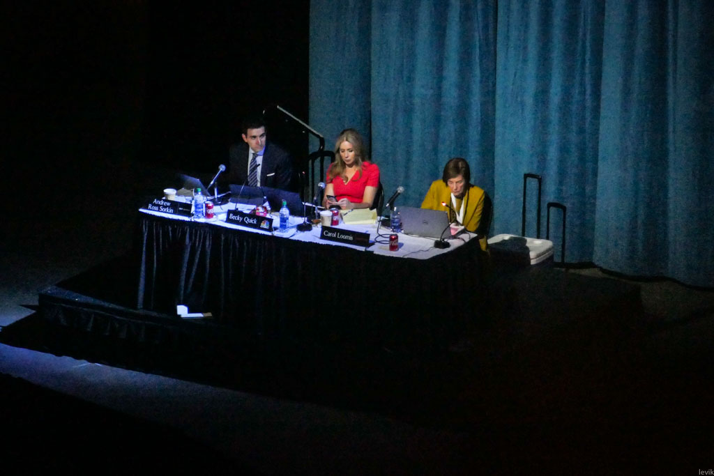 Журналисты представляют разные важные американские СМИ. Они задают главам компании вопросы, которые присылают через интернет (они отбирают самые интересные на своё усмотрение).