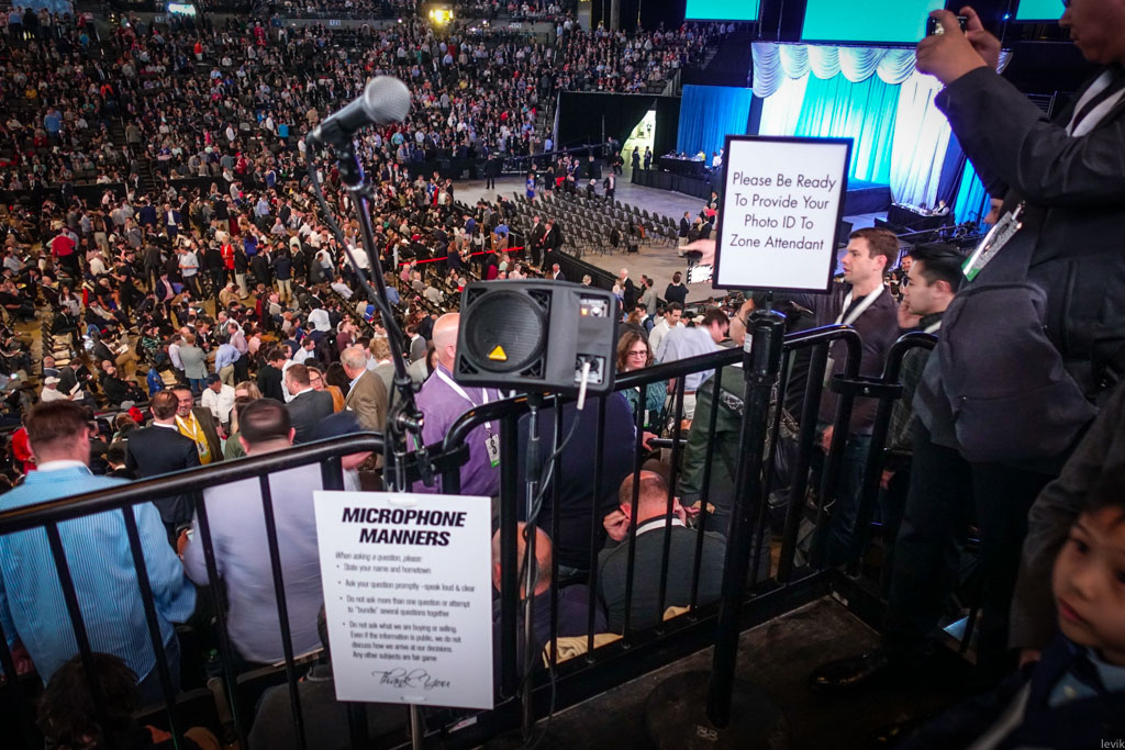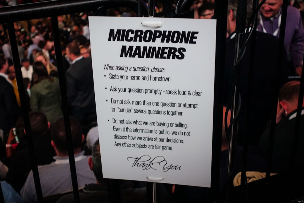 Рядом с каждым микрофонов висят правила этикета: Представьтесь, задавайте вопрос чётко, и не пытайтесь скомкать несколько вопросов в один. А главное, не спрашивайте про то, какие конкретные инвестиции мы покупаем или продаём. Даже если это общеизвестная информация.