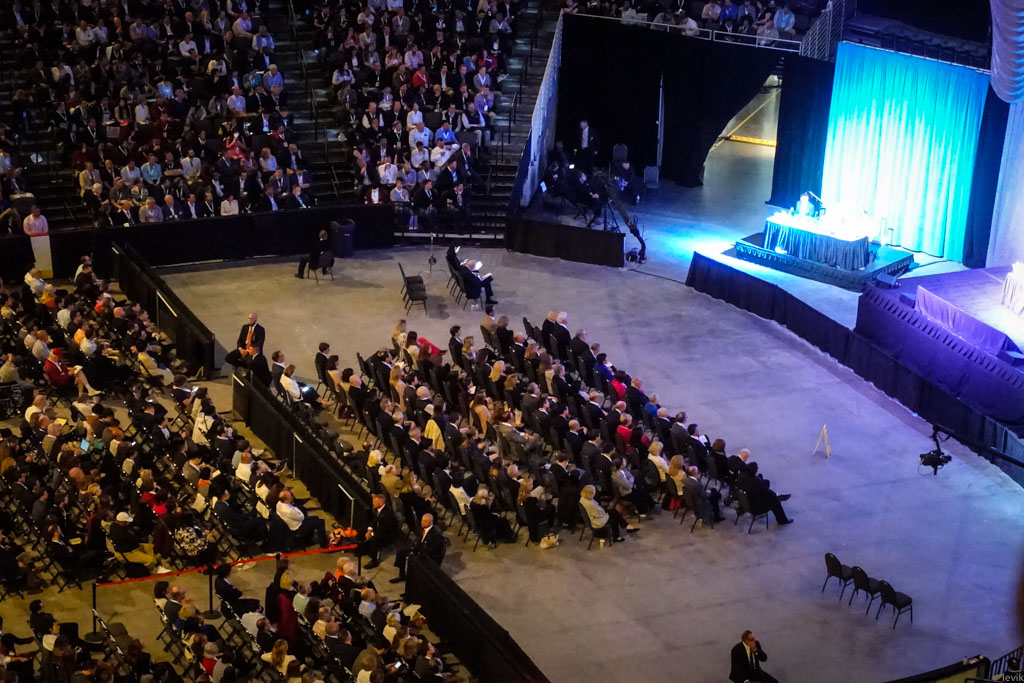 В передней части арены отведена специальная VIP зона. Там в рядах простых складных стульев сидит руководство компании, и члены совета директоров. Например, в этом году, среди них были Билл Гэйтс, основатель Microsoft, и Тим Кук, глава компании Apple.