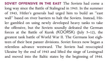 "Советское наступление на востоке. Советы прошли долгий путь с Битвы за Сталинград в 1943. Летом 1943 генералы Гитлера уговаривали его выстроить "восточную стену" вдоль речных рубежей, чтобы остановить Советские войска. Вместо этого Гитлер решил рискнуть, используя новейшие тяжёлые танки, чтобы перейти в наступление. Но советская армия решительно победила немецкие силы в Битве Курской Дуги (5-12 июля), величайшей танковой битве Второй Мировой Войны. Немцы потеряли восемнадцать из своих лучших танковых дивизий. Отсюда Советские силы начали своё непрерывное наступление на запад. Они отвоевали Украину к концу 1943, сняли блокаду с Ленинграда, и двинулись в прибалтийские республики к началу 1944 года."