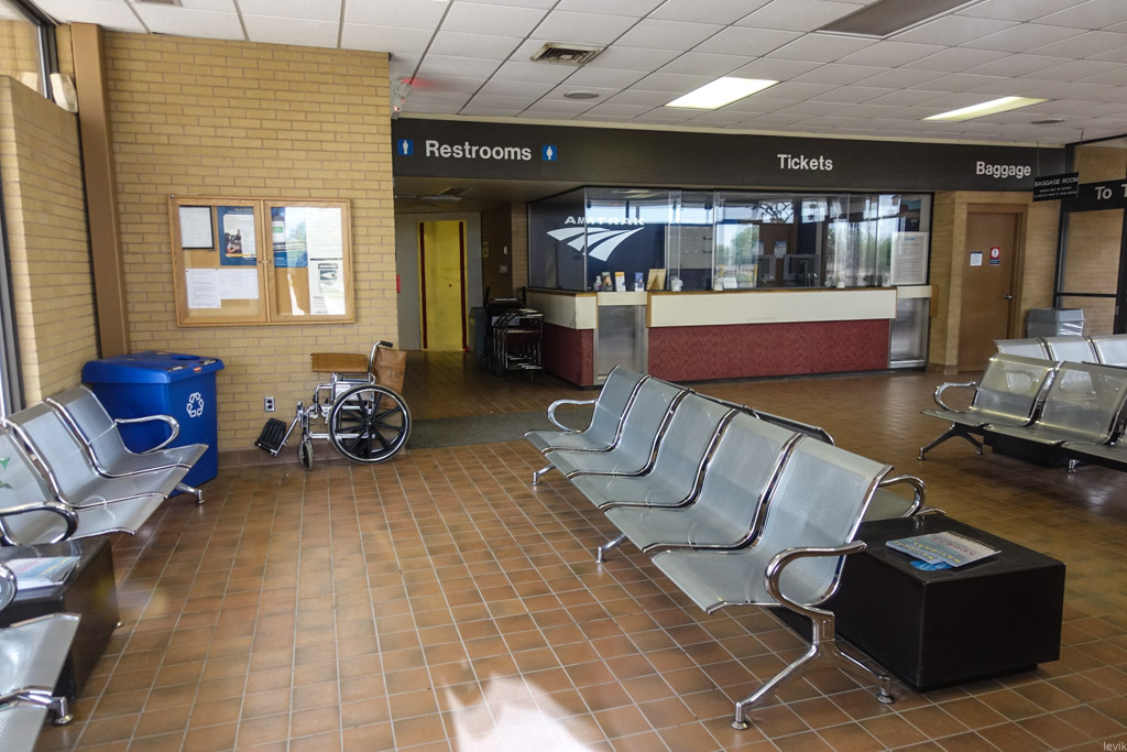 27. Я заглянул внутрь через немытое стекло. Внутри виднеется касса и небольшой зал ожидания. Всё это очень прозаично, особенно по сравнению с великолепным интерьером соседнего вокзала Юнион.