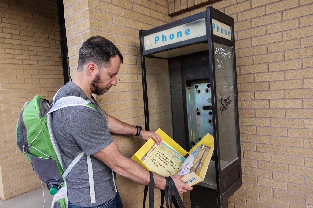 28. Снаружи станции ещё сохранилась телефонная будка. Самого телефонного аппарата в ней уже нет, но зато до сих пор висит огромный справочник Yellow Pages. Металлическая обложка уберегла эту толстую книгу от натиска стихии на протяжении долгих лет, кажется она там с конца нулевых.