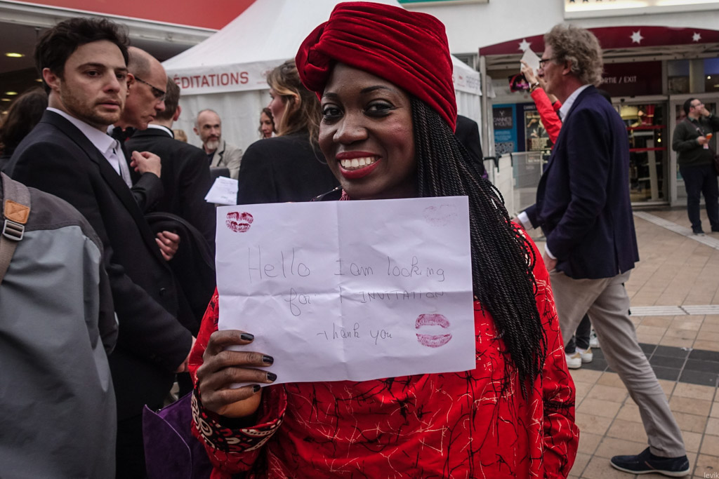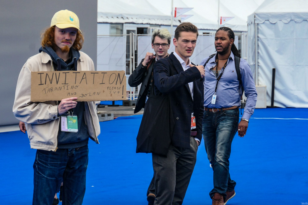 1. Не уверен, на что рассчитывают такие люди - ведь билеты на показы в Каннах просто так ре достать. И стоят они порой недёшево. Но всё же хорошо одетые фестивальщики стоят перед входами в театры с табличками. Иногда там просто написано "нужно приглашение. спасибо!".