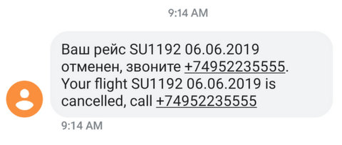 Пока я смотрел на неё, пытаясь понять, какой из моих рейсов отменили, поступил телефонный звонок, и автоматический голос повторил ту же самую информацию (тоже на двух языках). А ещё через минуту, я получил электронное письмо, которое тоже оповещало меня об отмене рейса SU1192.