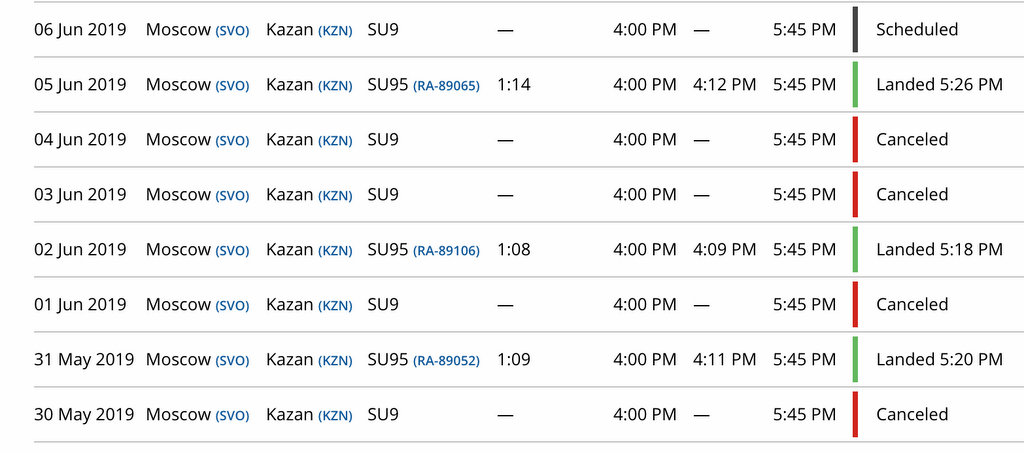 Но буквально через два дня у Суперджета была незапланированная посадка, в ходе которой погибли больше чем половина пассажиров. Это меня насторожило, и я начал проверять - а столь ли безопасен этот самолёт, что мне стоит им лететь? Первое на что я смотрел это другие рейсы Аэрофлота, осуществляемые лайнером. Многие из них были в следующие несколько дней отменены.
