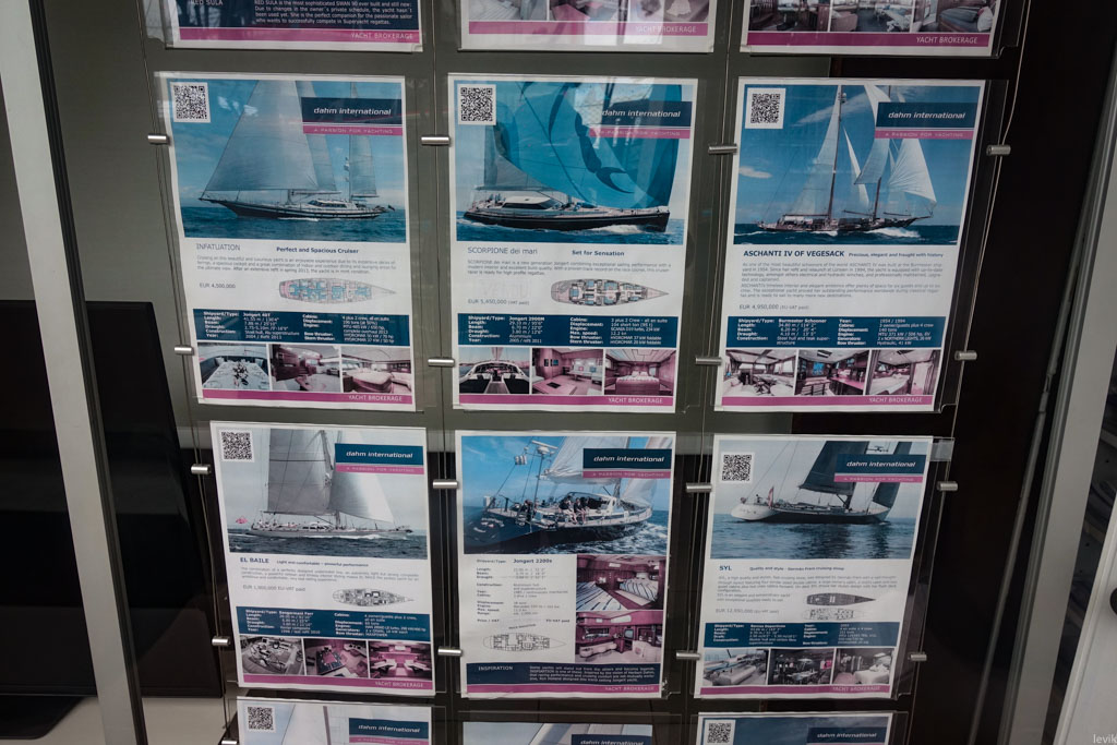 8. Уважающий себя житель Монако не нуждается в квартире (у него наверное уже есть парочка!) Что ему реально нужно в жизни, так это яхта. И такие вот агентства готовы её продать. На витрине перечисляются текущие предложения, с ценниками от двух до двенадцати миллионов. (Средненькие - около пяти.)