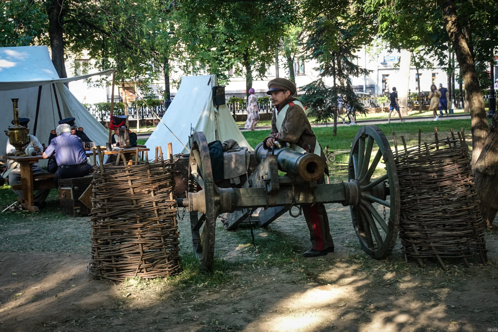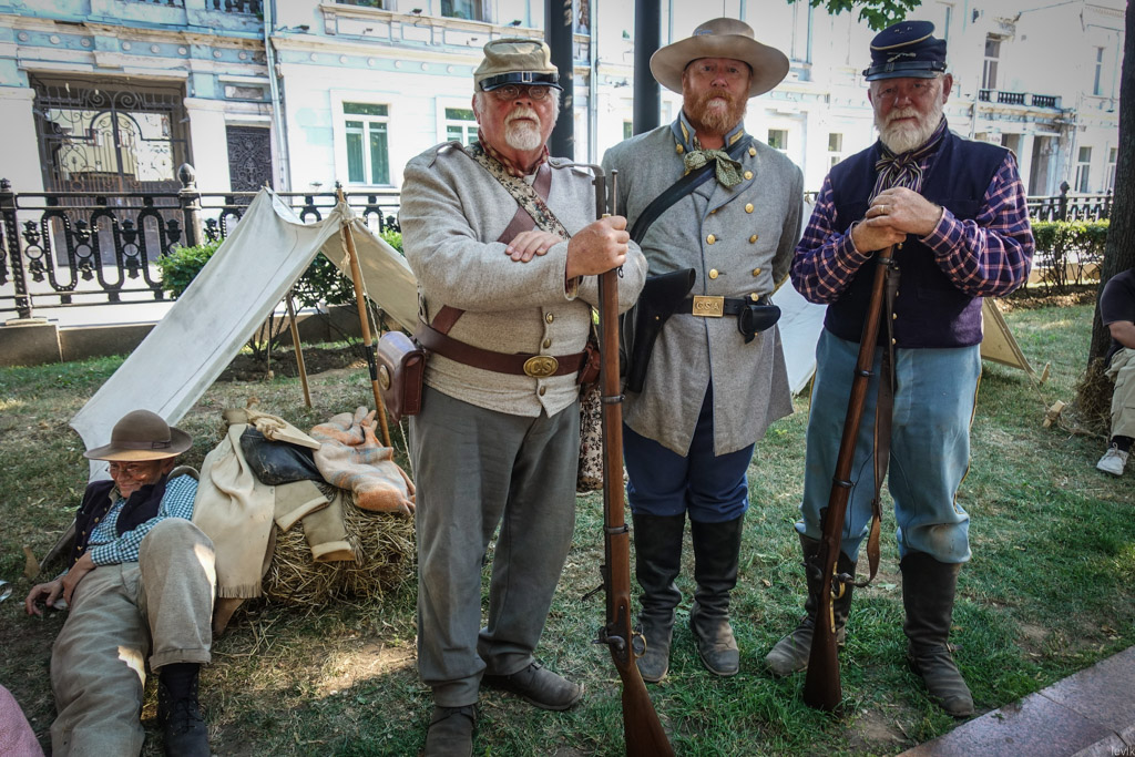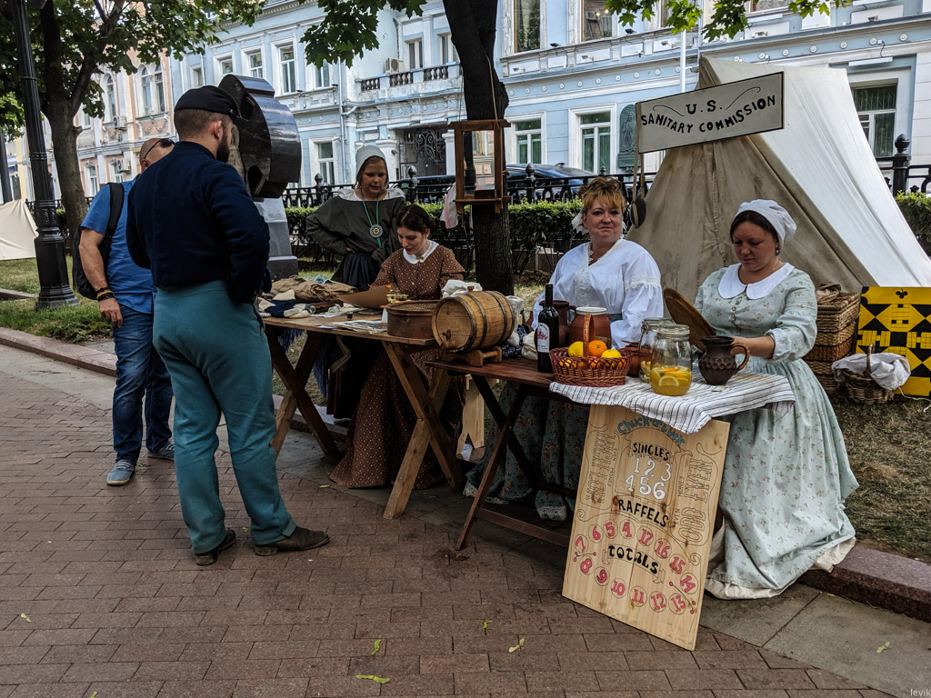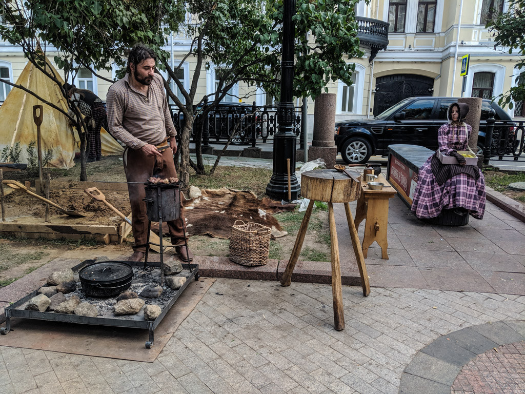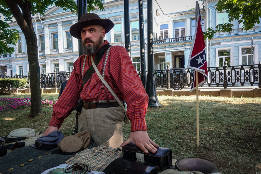 3. Эти трое изображают американских солдат-южан периода Гражданской Войны в США. Я подошёл пообщаться с ними, оказалось это англичане, которые приехали в Москву по приглашению администрации фестиваля. Зарплату им не платят, но покрыли расходы на дорогу и проживание (возможно, и визу тоже оплатили?) В Москве, как объяснил мне тот, что слева, им очень нравится, и они непременно снова сюда вернутся при возможности.