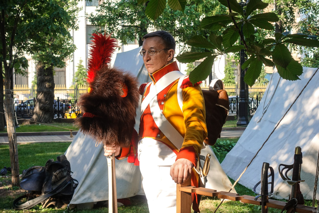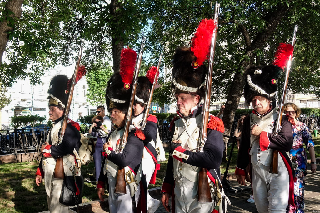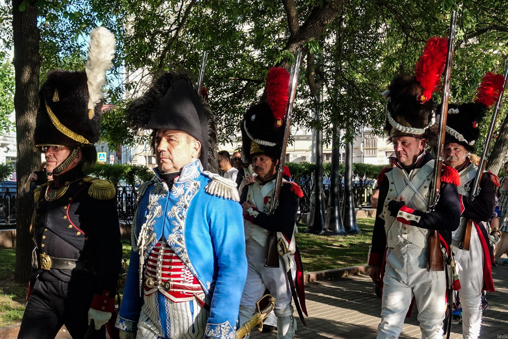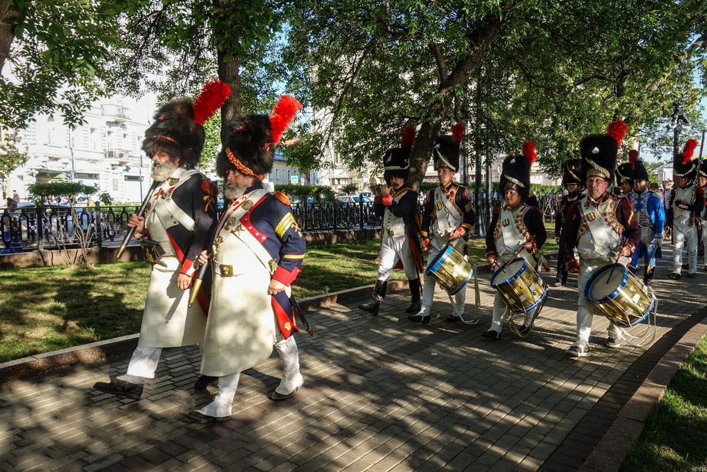 6. Англичане, притворяющиеся американцами - не единственные иностранцы, которых приглашают на фестиваль. Мне объяснили, что сюда съезжаются энтузиасты многих стран. И среди них - великолепные французы наполеоновской эпохи. Этот великолепный отряд прошёл под барабанную дробь вдоль Чистых Прудов под всеобщее ликование.