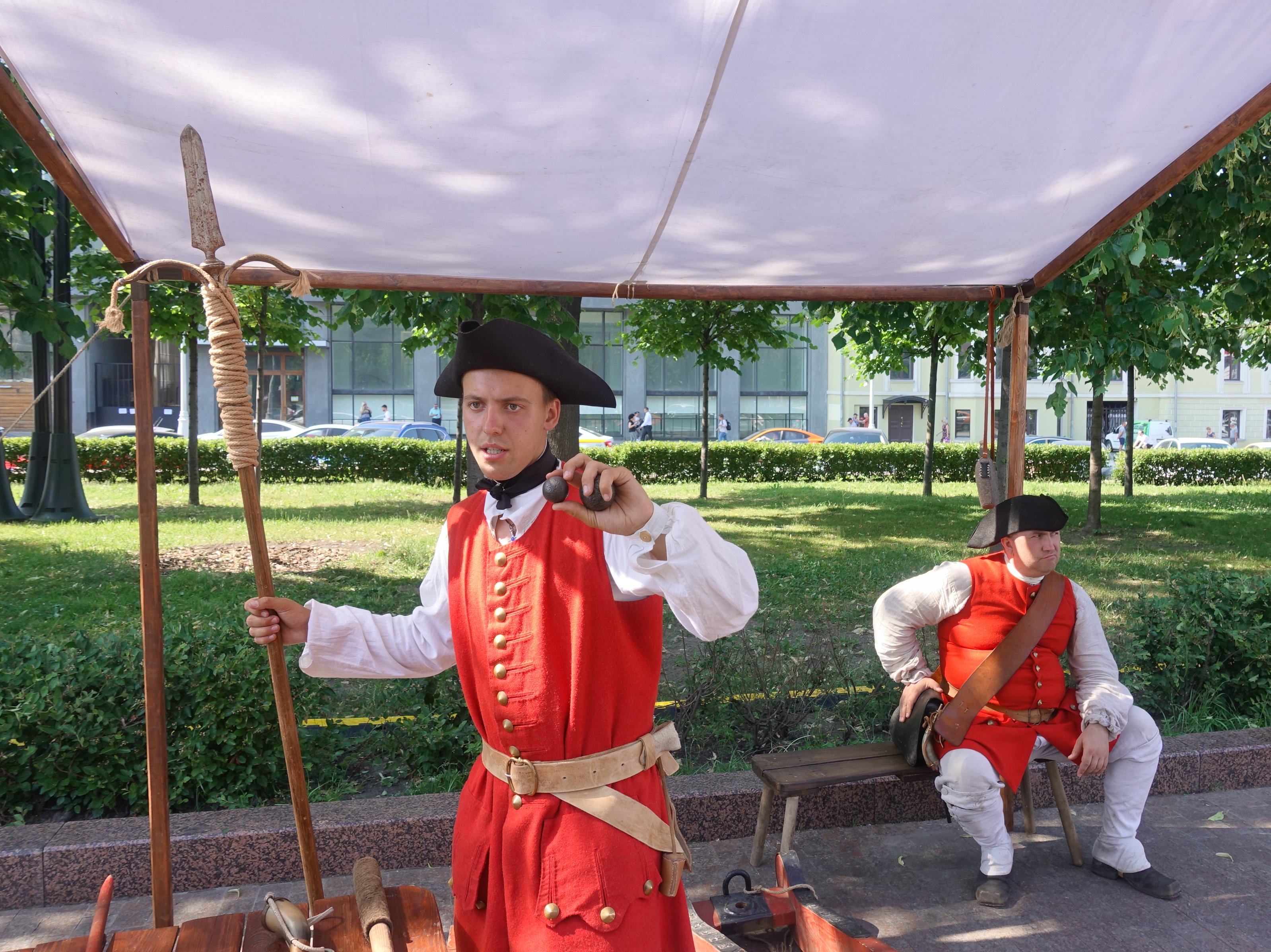 8. Солдат эпохи Северной Войны показывает какими ядрами стреляли тогдашние пушки.