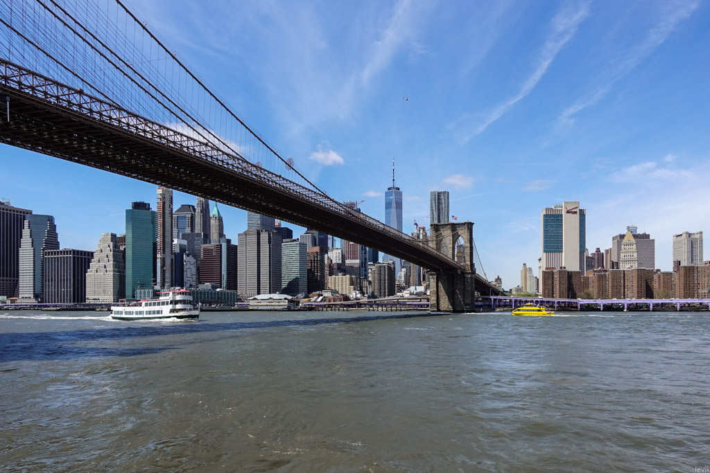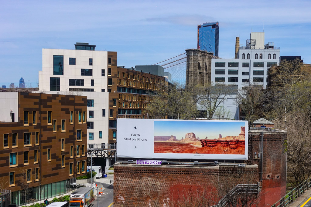 1. Начнём в Бруклине, на променаде Бруклин-Хайтс. Здесь всегда висит огромный рекламный щит компании Apple. Раньше они рекламировали конкретную технику, можно было определить год фотографии по модели Айфона или Айпада, которую тут нахваливали. А сейчас просто хвастаются фотографическими способностями своих телефонов. Лет десять назад с этой точки отлично был виден Бруклинский мост, но построенные недавно здания теперь загородили его, торчит лишь верхушка одной из опор.