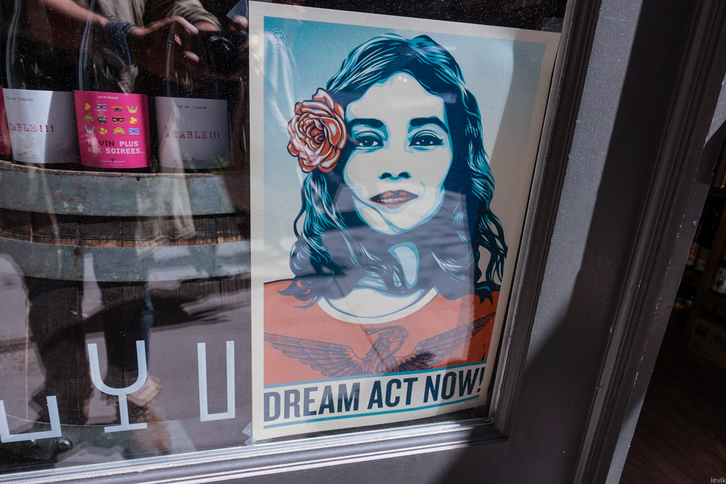 8. В витрине одного из соседних магазинов я заметил плакат в поддержку иммигрантов, автор которого - знаменитый художник Шепард Фейри. (Он создал знаменитое предвыборное изображение Барака Обамы, "Hope".) Этот плакат был основан на фотографии девушки мексиканского происхождения. Как вы можете себе представить, местные жители довольно либеральны.