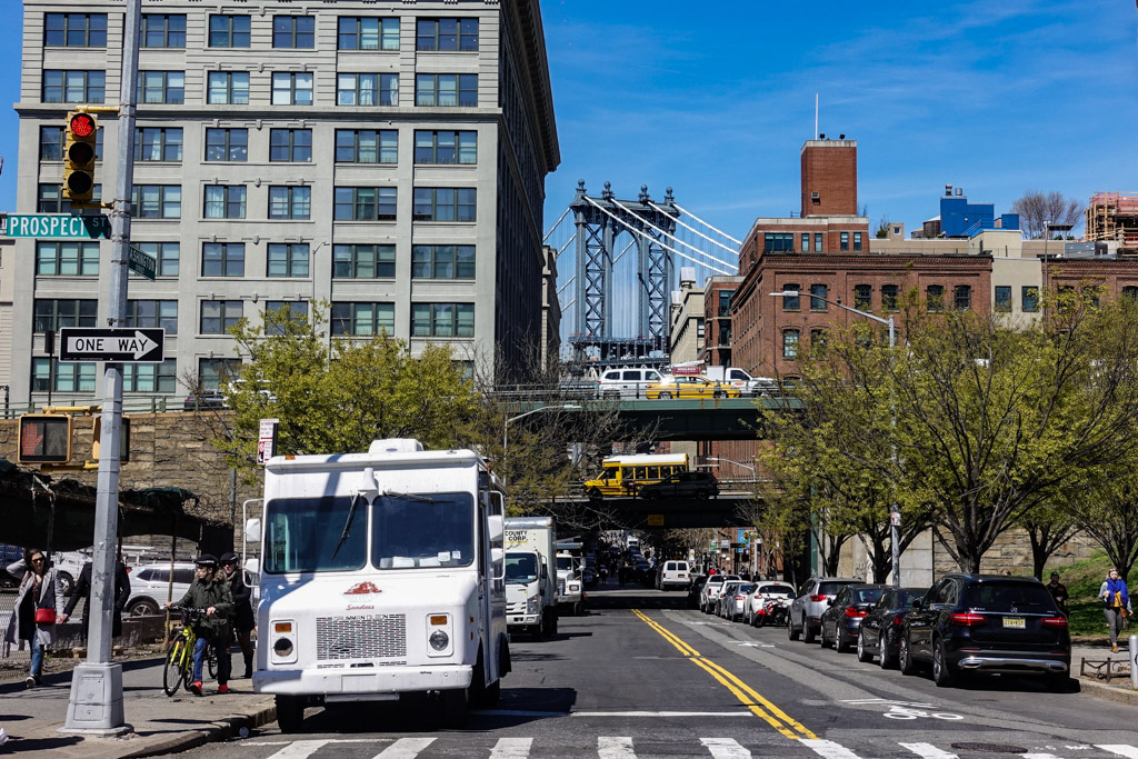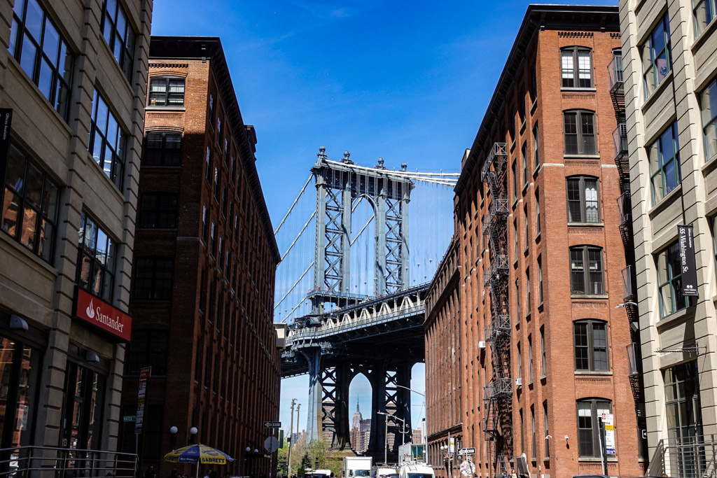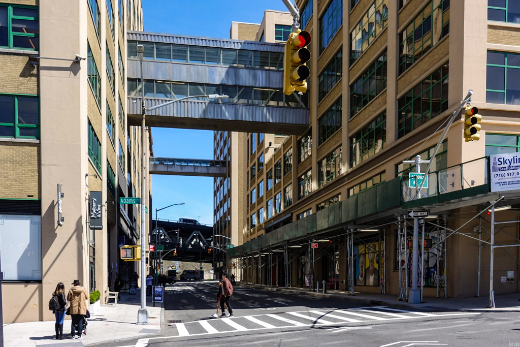 4. Мы находимся в Дамбо, где сходятся Бруклинский И Манхэттенский мосты. В здешних зданиях иногда можно увидеть вот такие уродливые переходы через дорогу. Кажется, хозяин соседних зданий хотел таким образом сэкономить своим сотрудникам время. Могли бы и посимпатичней их сделать.