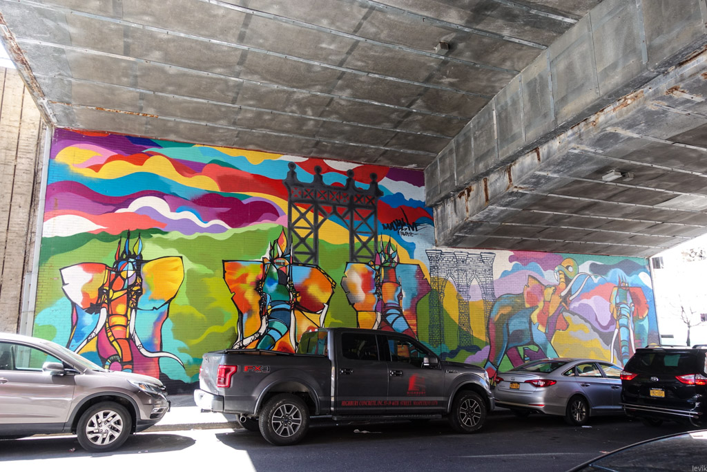 6. Под одним из таких проездов кто-то нарисовал великолепных слонов. Похоже, это стрит-арт того же художника, что изобразил целую серию этих животных совсем неподалёку. За ними нарисована опора Манхэттенского моста.