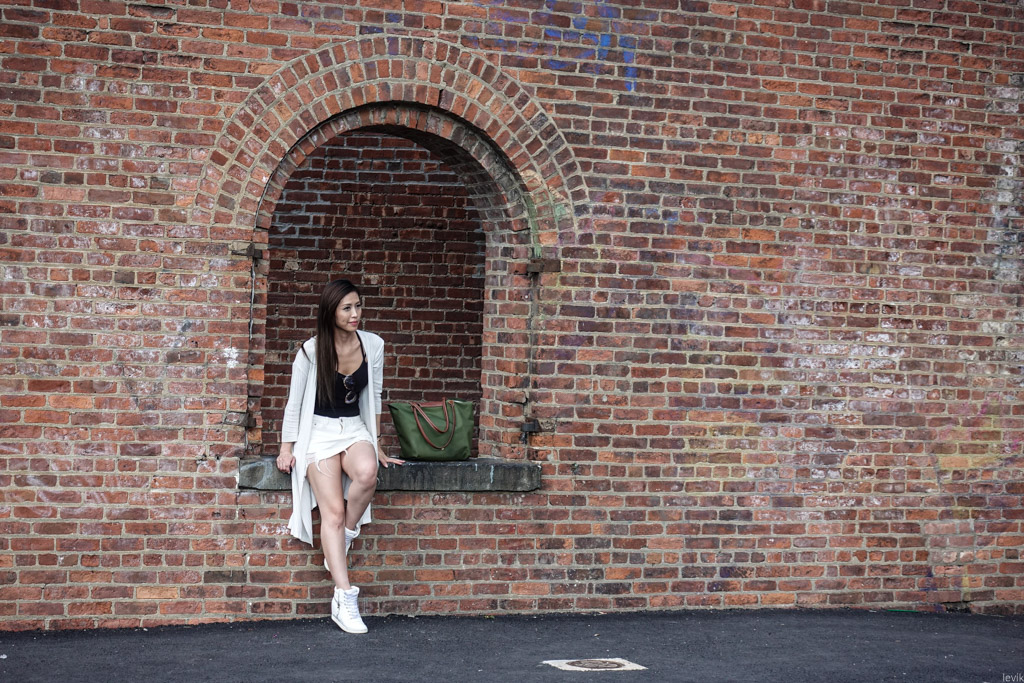 9. Азиатская девушка позирует возле бывшего склада у подножия Бруклинского Моста в Дамбо.