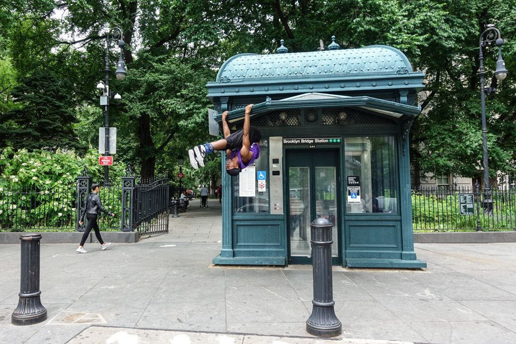 7. Парень с заглавной картинки, просто подтягивался зацепившись за крышу выхода из метро (станция Brooklyn Bridge).