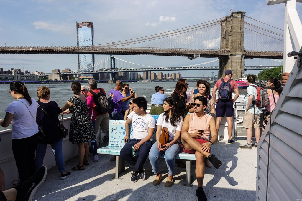 17. Люди и мосты. Это пассажиры на верхней палубе речного такси, которое в сравнительно недавно запустили в Нью Йорке. Летом - отличный способ передвигаться по городу.