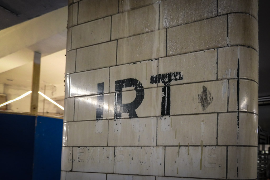 4. Спустимся вниз на станцию. На одной из опор остался след от трёх букв "IRT". Это тоже кусочек истории. Когда-то в Нью Йорке было три конкурирующие системы метро. IRT, "Interboro Rapid Transit" была самой ранней из них. В 1940 году город выкупил это компанию, и она перестала существовать. Однако её следы остаются по сей день, почти 80 лет спустя.