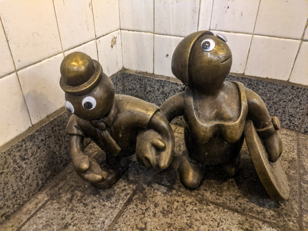 33. И ещё. По пути на работу заметил, что кто-то прицепил пластмассовые глаза на маленьких бронзовых человечков Тома Оттернесса. Очень забавно.
