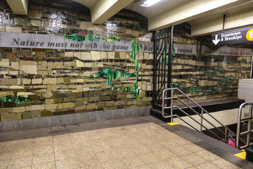 12. А на остановке, куда ведёт переход ещё больше слоёв почвы, сквозь которую пробивается зелень. Тут же цитата Карла Юнга о природе: Она не может победить, но и проигрывать не должна.