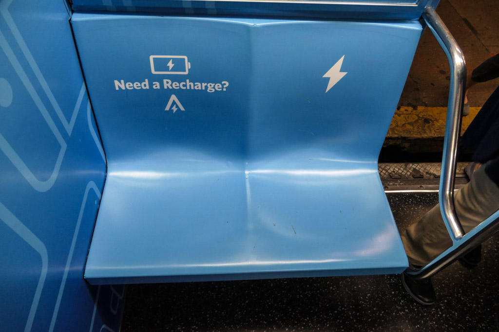 21. "Челночная" ветка обслуживается двумя короткими поездами, каждый из которых ходит по своему пути туда-обратно. Это были первые поезда в системе, которые начали полностью обклеивать рекламой. Причём продают сразу весь поезд. Один сейчас рекламирует пауэрбанки Anker...