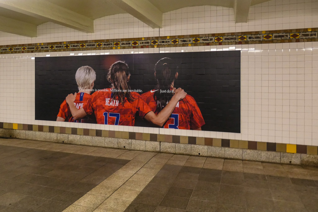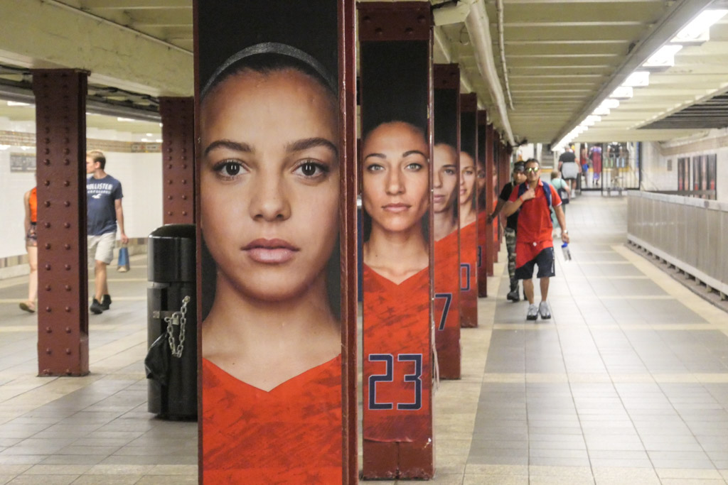 25. Раз уж мы заговорили о рекламе, стоит сказать, что сейчас начали появляться любопытные бренд-кампании, где заклеивают целые станции. Например, компания Nike, пользуясь темой победы женской футбольной команды США на Чемпионате Мира, развесила в метро рекламу с футболистками.